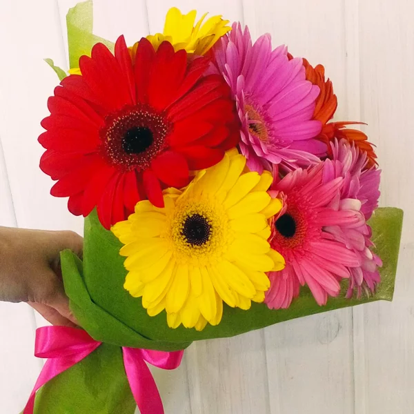 поможет солнечное сочетание пестрых гербер. Нежно розовый цвет намекнет о симпатии,  желтый о дружеском интересе, оранжево-красный станет комплиментом, а насыщенно-розовый
