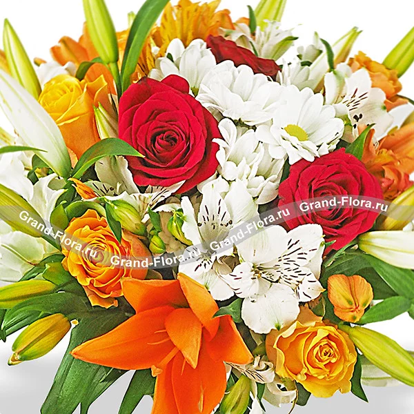 Стандартный (на фото): лилия желтая - 3 шт., роза желтая - 4 шт., роза красная - 3 шт., альстромерия белая - 3 шт., хризантема кустовая ромашковая (белая) - 1 шт., сетка желтая.