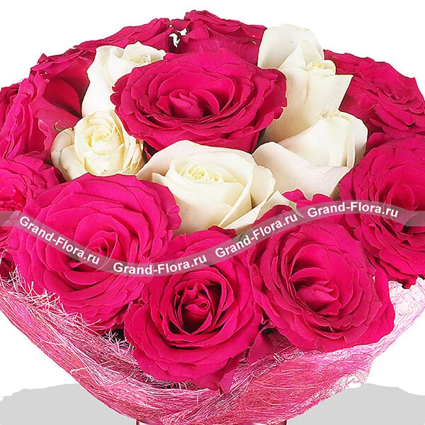 ДЕЛЮКС: роза розовая - 14 шт., роза белая - 11 шт., сизаль розовый, бант розовый. Примерный размер: 45Х45 см.