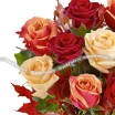11 роз: роза красная - 4 шт., роза оранжевая - 4 шт., роза кремовая - 3 шт., Декор - осенние листья.