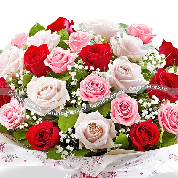 Изящное сочетание элегантных белых, розовых и красных роз деликатно дополнено гипсофилом и салалом.