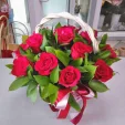 Выбрали 51 розу. Заказали доставку по случаю юбилея нашего руководителя и очень рады что выбрали именно эту компанию! Все соответствует фото на сайте: светлая корзина и отменные, крупные красные розы.