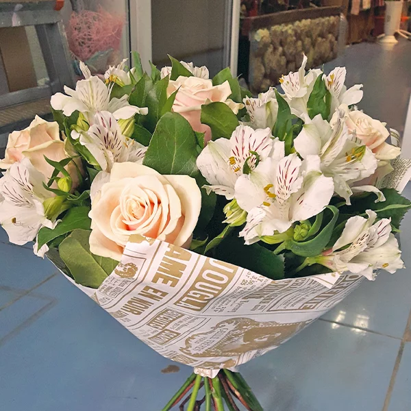 Букет нежнейший!!! Великолепные, крупные розы, очень красивая альстромерия. Свежо и красиво. Доставка очень понравилась. Обращусь к вам снова.
