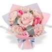 Уменьшенный: роза розовая - 6 шт., тюльпан розовый - 3 шт., эвкалипт, упаковка, лента.