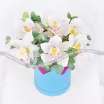 Стандартный: орхидея белая - 7 бутонов, эвкалипт, оазис, коробка. Примерный размер: 25Х30 см.