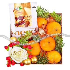 Уменьшенный: апельсины - 2 шт., яблоки - 1 шт., лимоны - 1 шт., киви - 1 шт., бананы - 1 кг., оазис, роза кустовая кремовая - 2 шт., декоративная зелень, ель, декор, корзина малая.