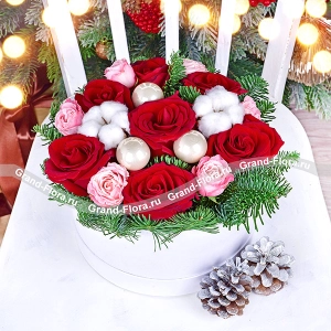 Уменьшенный: роза белая - 3 шт., кустовая роза розовая - 2 шт., эвкалипт, хлопок, шарик - 1 шт., ель, упаковка, лента.